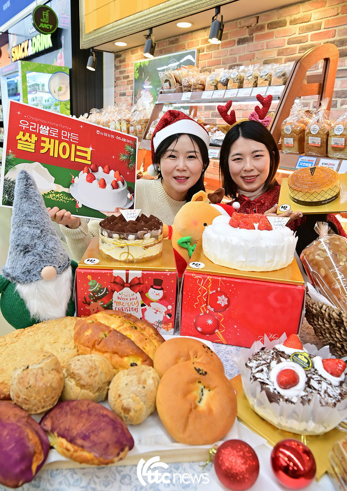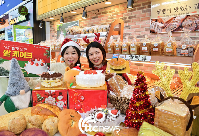 | ▲ 12월 24일 서울 서초구 하나로마트 양재점에서 모델들이 연말 모임에 잘 어울리는 쌀 케이크를 소개하고 있다.(사진=농협유통 제공) |