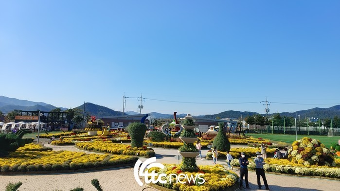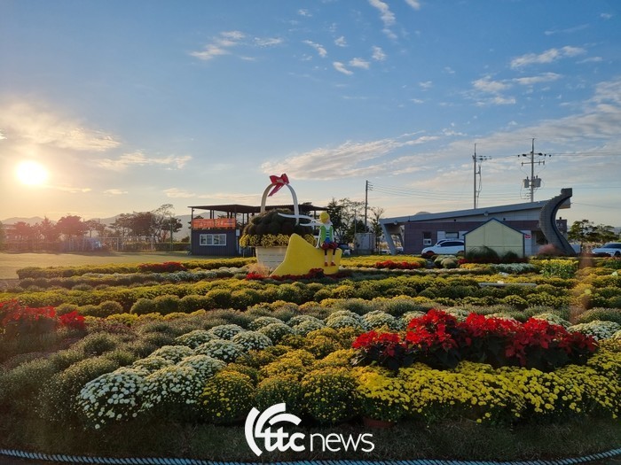 | ▲ 강진군은 강진만 갈대생태공원 입구부터 전망대 앞까지 약 2,500㎡ 면적의 공간에 국화 화분 15,000개와 조형물 15점을 활용해 전시 공간을 마련했다.(사진=강진군 제공) |