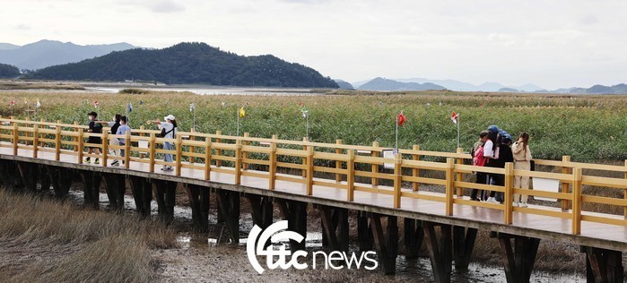 | ▲ 강진만 생태공원 산책로에서 춤추는 갈대를 감상하는 시민들(사진=강진군 제공) |
