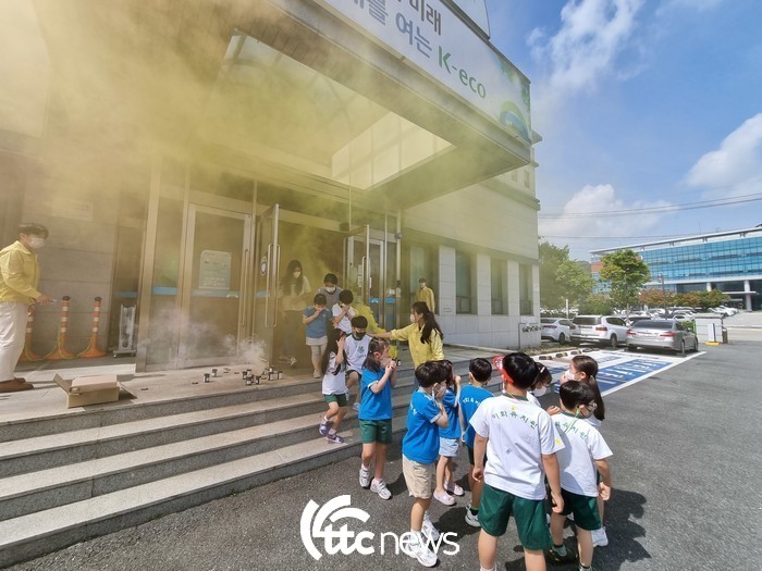 | ▲ 한국환경공단 전북 홍보관에서는 어린이, 초등학생을 대상으로 인근 소방서와 합동으로 방독면 착용, 화재대피, 소화기 및 소화전 사용 방법 등 국민참여훈련을 실시했다.(사진=한국환경공단 제공) |