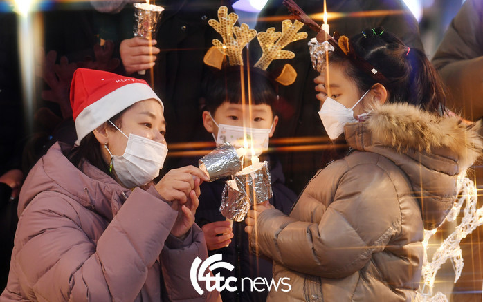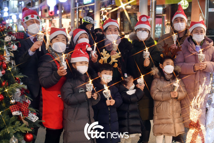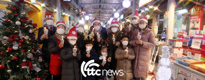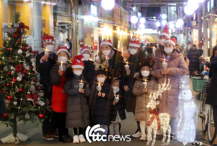| ▲ 비대면 상황에도 성탄절이 찾아왔습니다. 인류를 위협하는 역병 속에서도 아기 예수의 탄생은 모두의 기쁨입니다. 온 땅에 평화의 종소리가 울려 퍼집니다. 사랑의 종소리가 세상 가득합니다. 단절된 세상이 회복되길 바라는 기도가 넘쳐납니다. 서울 천호동 고분다리시장 상인들이 평화의 촛불을 켜고 성탄의 기쁨을 나누고 있습니다. |