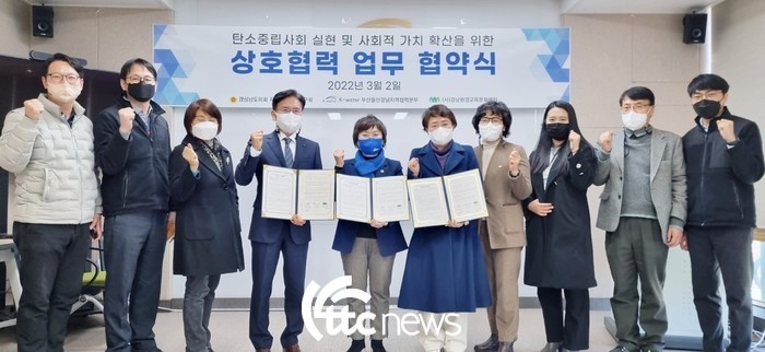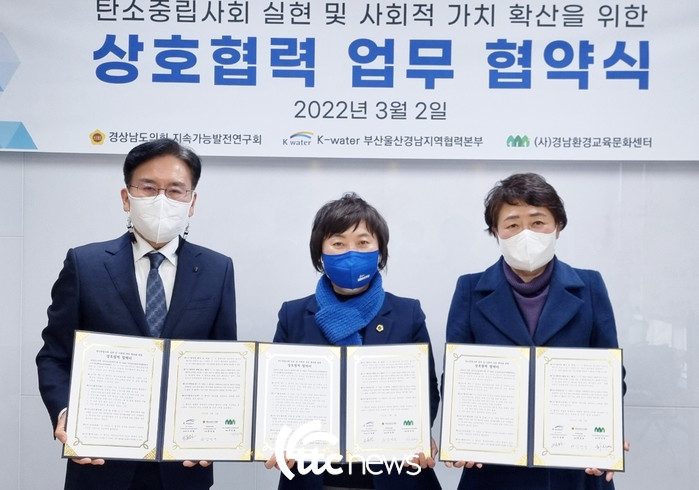 경남도의회와 K-water 부산울산경남 지역협력본부, 경남환경교육문화센터는 2일 K-water 부산울산경남 지역협력본부에서 공동협약식을 갖고 갈수록 심각해지는 기후위기와 환경오염 등에 대응하고 교류·협력을 통한 탄소중립사회 실현 방법과 경남지역의 지속가능한 발전방안을 모색하기로 했다.