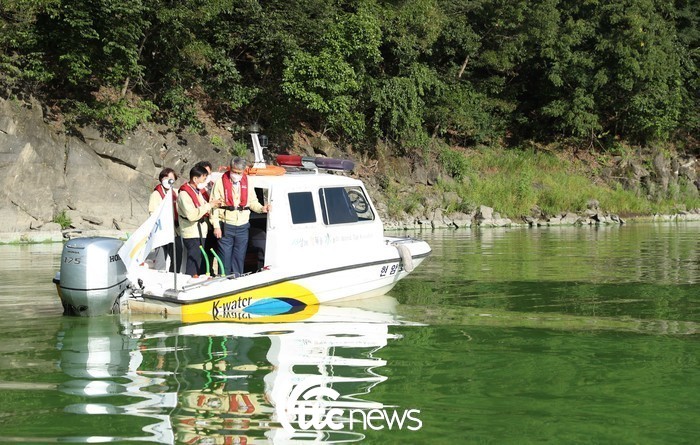 | ▲ 한국수자원공사 박재현 사장(오른쪽)이 19일 대청호 상류 서화천 수역의 녹조 발생 현장을 방문하여 녹조 발생 현황 및 대응상황 등을 점검하고 있다. (사진=한국수자원공사 제공) |