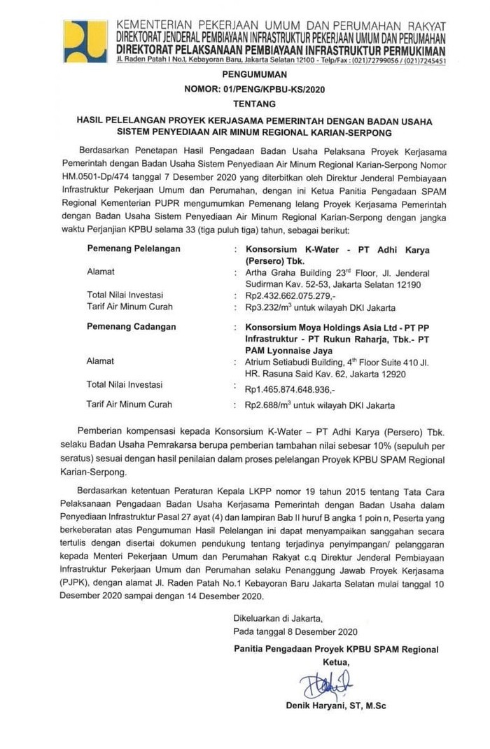 | ▲ 인도네시아 공공사업부 홈페이지에 "K-water컨소시엄이 Karian상수도사업 입찰에 선정되었다"고 발표되었다(사진=인도네시아 공공사업부 홈페이지 캡쳐) |