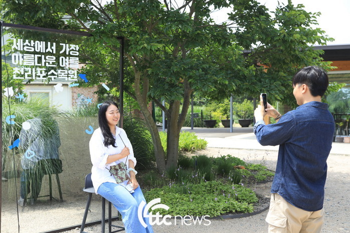 | ▲ 천리포수목원포토존에서 관광객이 사진촬영하고 있다.(사진=천리포수목원 제공) |