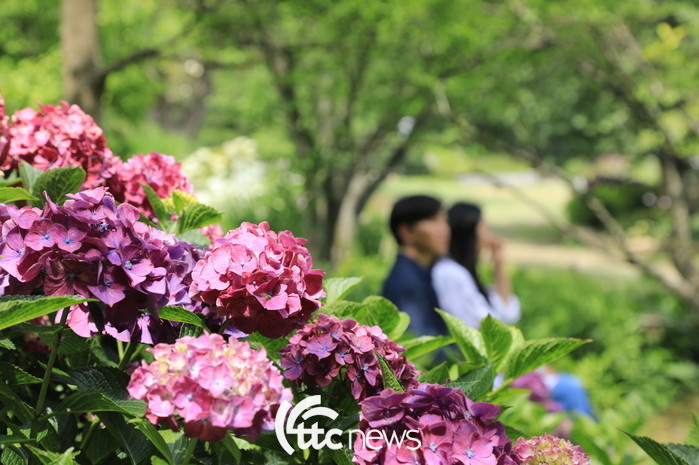 | ▲ 본격적인 더위의 시작을 알리는 소서인 7일 충남 태안 천리포수목원에 여름꽃이 활짝 폈다. 관광객들이 활짝 핀 수국을 촬영하고 있다(사진=천리포수목원 제공) |