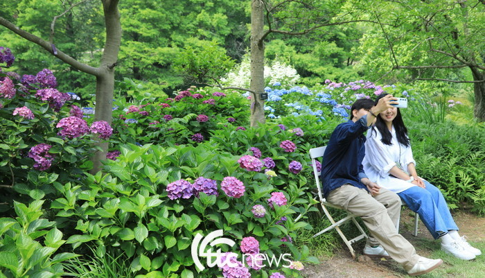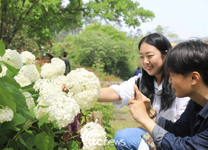 | ▲ 본격적인 더위의 시작을 알리는 소서인 7일 여름꽃이 활짝핀 충남 태안 천리포수목원에서 관광객들이 활짝 핀 수국을 촬영하고 있다(사진=천리포수목원 제공) |