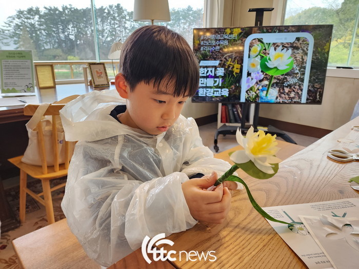 | ▲ 천리포수목원은 7월 여름꽃놀이 기간을 맞아 오는 22일까지 매주 목, 금 토요일 오전 10시, 오후 2시에 체험프로그램을 운영한다. 한 어린이가 ‘한지꽃 볼펜만들기’체험을 하고 있다.(사진=천리포수목원 제공) |