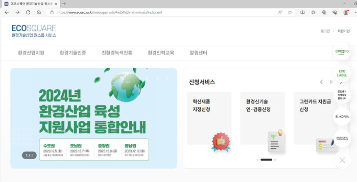 한국환경산업기술원은 환경산업 지원금, 환경신기술 인증 등의 환경 분야 각종 신청 서비스를 통합하여 제공하는 ‘에코스퀘어’(www.ecosq.or.kr)를 11월 27일 공개했다.