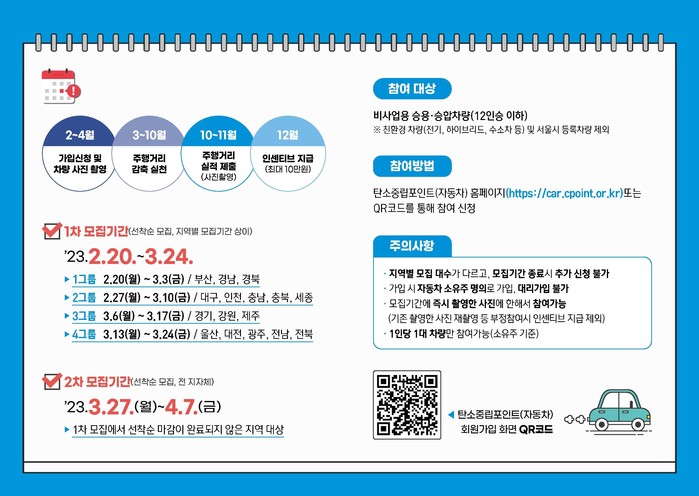 올해 새롭게 바뀌는 탄소중립포인트제(자동차)는 2월 20일부터(지역별 상이) 서울시를 제외한 전국에서 6만대를 선착순 모집하며, 참여 방법이 간소화된다.