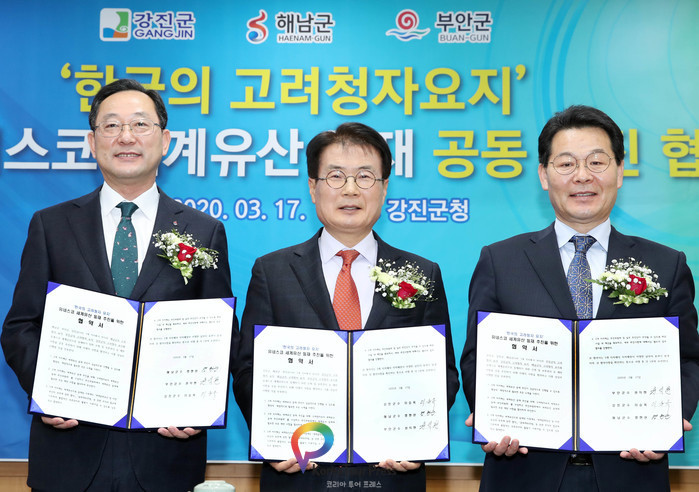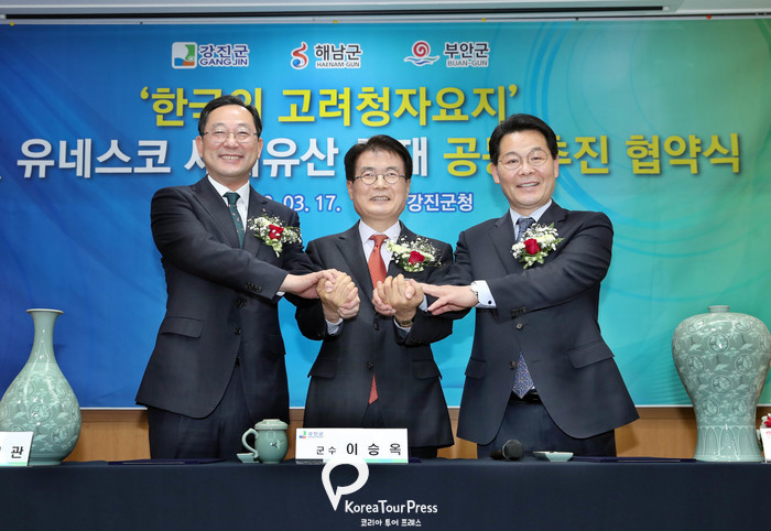 해남군과 강진군, 부안군은 고려청자요지의 세계유산 등재를 공동으로 추진하기로 하고, 17일 강진군청에서 업무협약(MOU)을 체결했다.