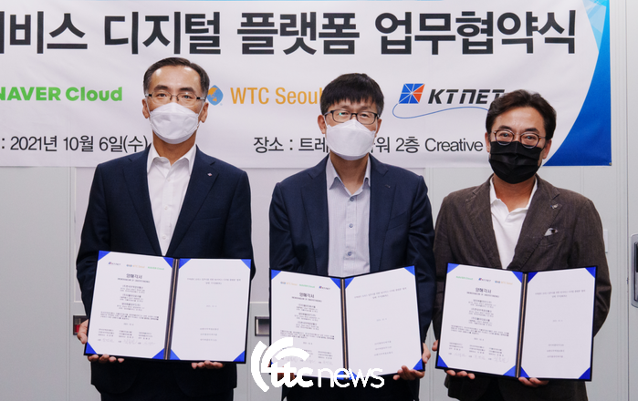| ▲ 6일 오전 서울 영동대로 트레이드타워에서 더블유티씨서울, 네이버클라우드와 한국무역정보통신은 무역센터 IT서비스 디지털 플랫폼을 위한 업무협약을 체결하고 (주)한국무역정보통신 차영환 대표이사, (주)더블유티씨서울 최용민 대표이사, 네이버클라우드(주) 임태건 상무가 기념 사진 촬영을 하고 있다.(사진 왼쪽부터) |