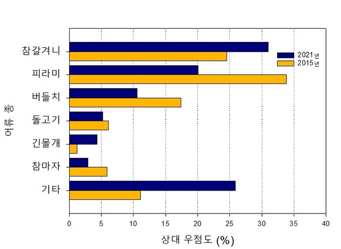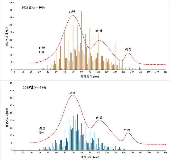 | ▲ 광릉숲 참갈겨니의 개체 크기 별 개체수 분포 변화 2015년과 비교하여 2021년 참갈겨니가 최대 크기와 개체 수 모두 증가한 것을 알 수 있다.(자료=국립수목원 제공) |
