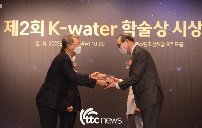 | ▲ 2일 서울 웨스턴조선호텔에서 개최된 제2회 K-water학술상 시상식에서 박재현 한국수자원공사 사장(왼쪽)이 고려대학교 김중훈 교수에게 물학술대상을 수여하고 있다. |