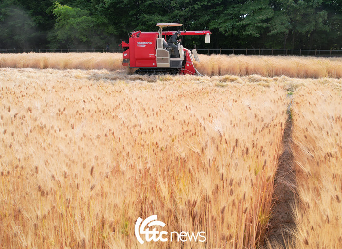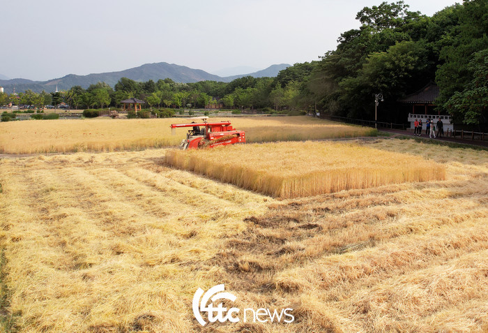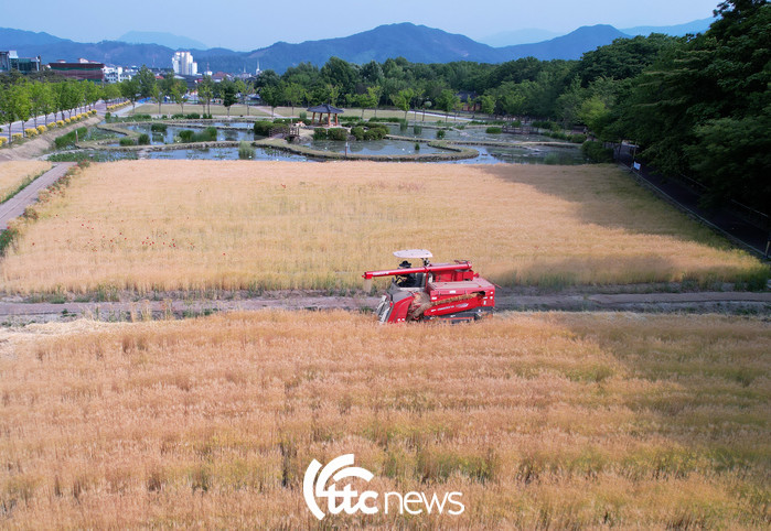 | ▲ 경남 함양군 함양읍 상림공원 경관단지에 심겨진 청보리가 누렇게 익어 25일 콘바인을 이용해 보리베기를 하고 있다.(사진=함양군 김용만 주무관 제공) |