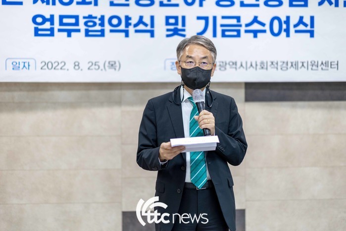 | ▲ 25일 한국환경공단 박찬호(사진) 경영기획본부장이 청년창업지원 기금 전달식 인삿말을 통해 “본 사업이 시작된 지 벌써 3년차로 탄소중립, 순환경제 등 환경문제의 해결과 청년창업 활성화 지원은 현 세대의 꿈과 희망을 지속가능한 미래로 연결하는 통로”라고 말하고 있다. |