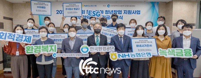 | ▲ 환경공단은 25일 인천시 사회적경제지원센터 세미나실에서 NH농협은행, 인천광역시 사회적경제지원센터와 함께 2022년 환경분야 청년창업 지원 기업으로 최종 선정된 환경기업 10개사에 사업화자금 각 800만원씩 모두 8,000만 원을 전달했다.(사진=한국환경공단 제공) |