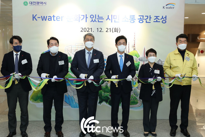 | ▲ 21일 대전시 대덕구 소재 한국수자원공사 본사에서 박재현 한국수자원공사 사장(사진 왼쪽에서 세 번째)이 허태정 대전시장(왼쪽에서 네 번째) 등 지자체 및 지역사회 관계자들과 함께 ‘K-water 문화예술이 있는 시민소통공간’ 조성을 알리는 테이프 절단식을 진행하고 있다(사진 왼쪽부터 한국수자원공사 박평록 기획부문이사,강래구 상임감사위원, 박사장, 허 시장, 박정현 대덕구청장, 김태성 대덕구의회의장. 사진=한국수자원공사 제공) |