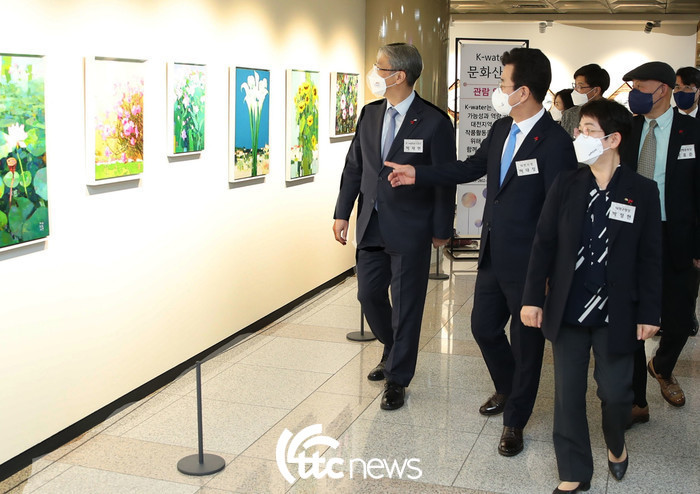 | ▲ 21일, 대전시 대덕구 한국수자원공사 본사에서 열린 ‘K-water 문화예술이 있는 시민소통공간’ 조성 보고회에서 박재현 한국수자원공사 사장(사진 왼쪽에서 첫 번째)이 허태정 대전시장(두 번째), 박정현 대덕구청장(세 번째) 등 참석자들과 함께 새로 조성한 갤러리 공간을 둘러보고 있다.(사진=한국수자원공사 제공) |