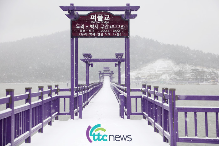 | ▲ 두리도와 박지도를 잇는 퍼플교에 흰눈이 내렸다. |