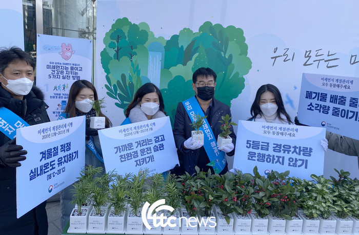 미세먼지 계절관리제 첫날인 1일 오전 서울 종로구 일민미술관 앞에서 환경부 소속 수도권대기환경청 관계자들이 ‘미세먼지 계절관리제’ 동참을 알리는 캠페인을 하고 있다.