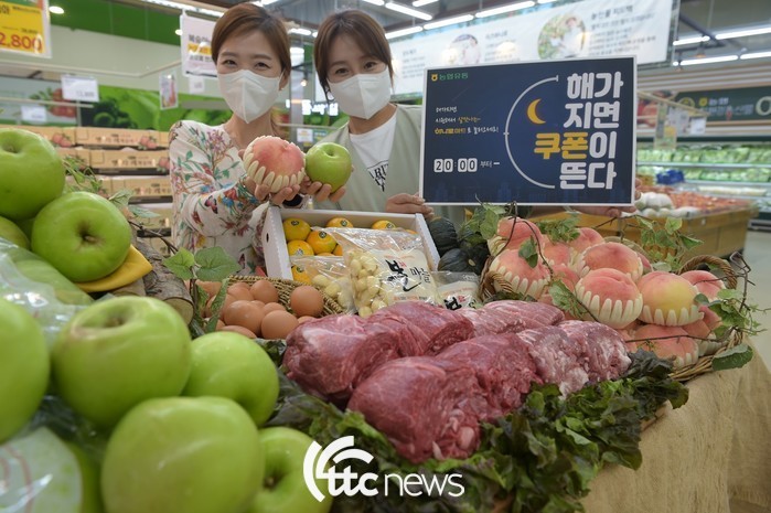 | ▲ 3일 서울시 서초구에 위치한 하나로마트 양재점에서 모델들이 여름철 더위를 피해 야간에 쇼핑하시는 고객을 위한 야간 쇼핑 전용 쿠폰과 삼성카드 결제 시 살맛나는 가격으로 구매할 수 있는 한우 불고기 · 돈육 앞다리 행사를 소개하고 있다.(사진=농협유통 제공) |