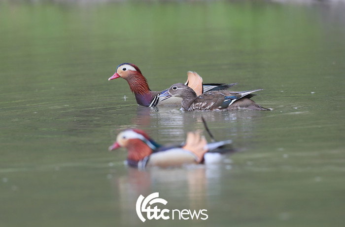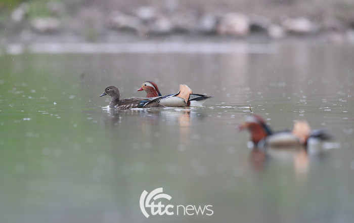| ▲ 12일 경남 함양군 천연의 숲 상림공원 연밭에서 천연기념물 제327호인 원앙가족이 봄비를 맞으며 물놀이를 즐기고 있다.(사진=함양군 김용만 주무관 제공) |