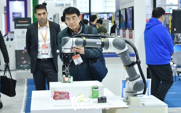 | ▲ 27일 서울 강남구 코엑스에서 열린 아시아 대표 스마트공장·자동화산업전(Smart Factory+Automation World 2024)을 찾은 관람객들이 유니버설 로봇의 협동로봇의 작동을 보고 있다. |