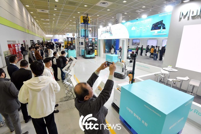 | ▲ 27일 서울 강남구 코엑스에서 열린 아시아 대표 스마트공장·자동화산업전(Smart Factory+Automation World 2024)을 찾은 관람객들이 멀티웨이 로보틱스의 무인 지게차 시연을 보고 있다. |