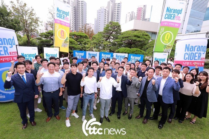 | ▲ 동아오츠카 임직원이 24일 서울 동대문구 동아오츠카 별관 앞에서 신제품 '나랑드사이다 파인애플'과 '나랑드사이다 그린애플' 2종 출시 기념 행사를 마치고 기념촬영을 하고 있다. |