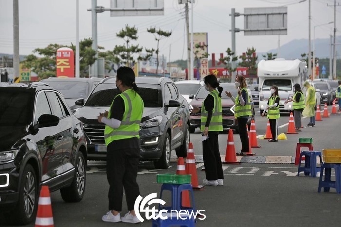 충남 보령 시 대천해수욕장 압구에 마련된 코로 나 19 검역소에서 지난 3일 운영요원들이 승용차에 탄 입장객에게 코로 나 19 확산 방지용 체온 스티커를 건네고 있다(사진=보령시 제공)