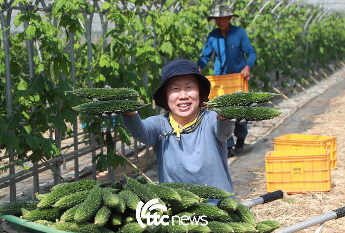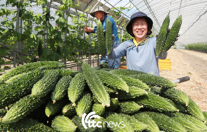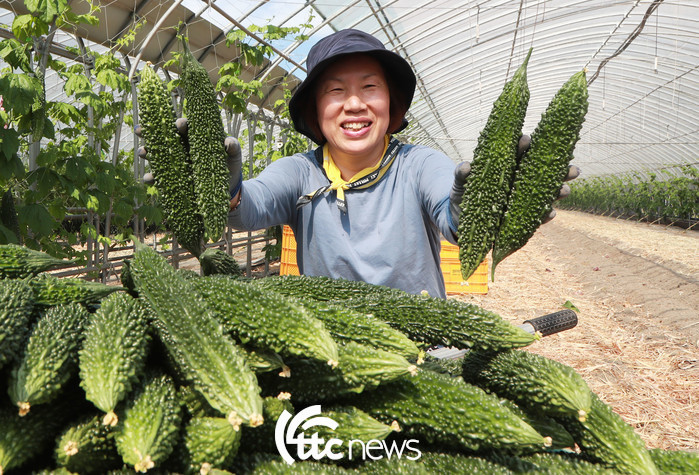 | ▲ 11일 경남 함양군 안의면 성북마을 우두식(63)씨 부부가 여주(쓴오이)를 첫 수확하고 있다.(사진=함양군 김용만 주무관 제공) |