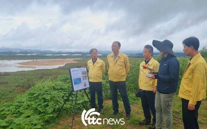 | ▲ 안병옥 한국환경공단 이사장이 예천지역 수해 현장을 둘러보고 있다(사진=한국환경공단 제공) |