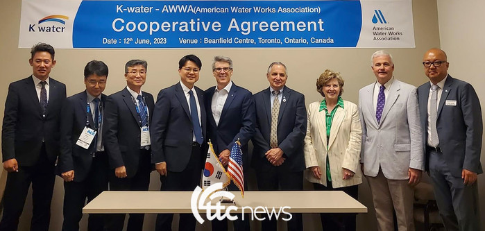 | ▲ 미국 최고의 물 관련 전시회인 ACE 2023가 캐나다 토론토에서 12일(현지시간) 개막되었다. 12일 한국수자원공사와 AWWA는 상호 협력협약을 체결했다. 사진 왼쪽부터 배대현 K-water미주센터장, 박동학 물산업혁신처장, 탁세완 미래수자원 처장, 김재학 수도관리처장이 AWWA 관계자들과 기념촬영하고 있다. |