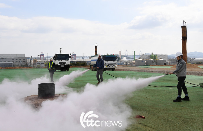 | ▲ 수도권매립지관리공사는 26일 제3-1매립장 현장에서실재 화재 발생시 신속하고 정확한 대응역량을 기르고 유관기관과의 협력 강화를 위해 합동 소방훈련을 실시했다.(사진=수도권매립지관리공사 제공) |