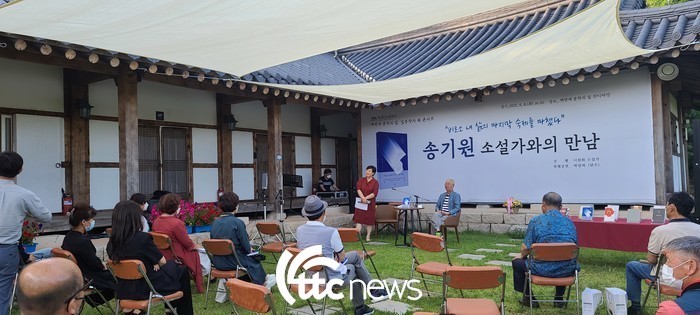 | ▲ 백련재 문학의 집과 땅끝순례문학관은 국내 유수의 작가들이 찾아오면서 살아있는 문학의 현장이라 할 정도로 활발히 운영되고 있다. 사진은 지난 8일, 7년 만에 장편소설을 발간한 송기원 작가의 북 콘서트 "비로서 내 삶의 마지막 숙제를 마쳤다"가 온.오프라인으로 진행되고 있다.(사진=해남군 제공) |