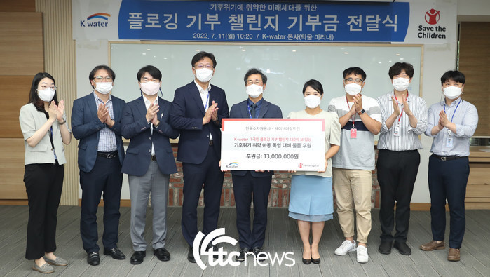 | ▲ 11일 대전 대덕구 한국수자원공사 본사에서 장훈 한국수자원공사 홍보실장(왼쪽에서 다섯 번째)이 , 유혜영 세이브더칠드런 서부지역본부장에게 “K-water와 함께 미래세대를 응원하는 플로깅 기부 챌린지”를 통해 조성한 13,000,000원의 '기후위기 취약 아동 폭염대비 물품 후원금'을 전달하고 양 기관 관계자가 기념촬영하고 있다(사진=한국수자원공사 제공) |