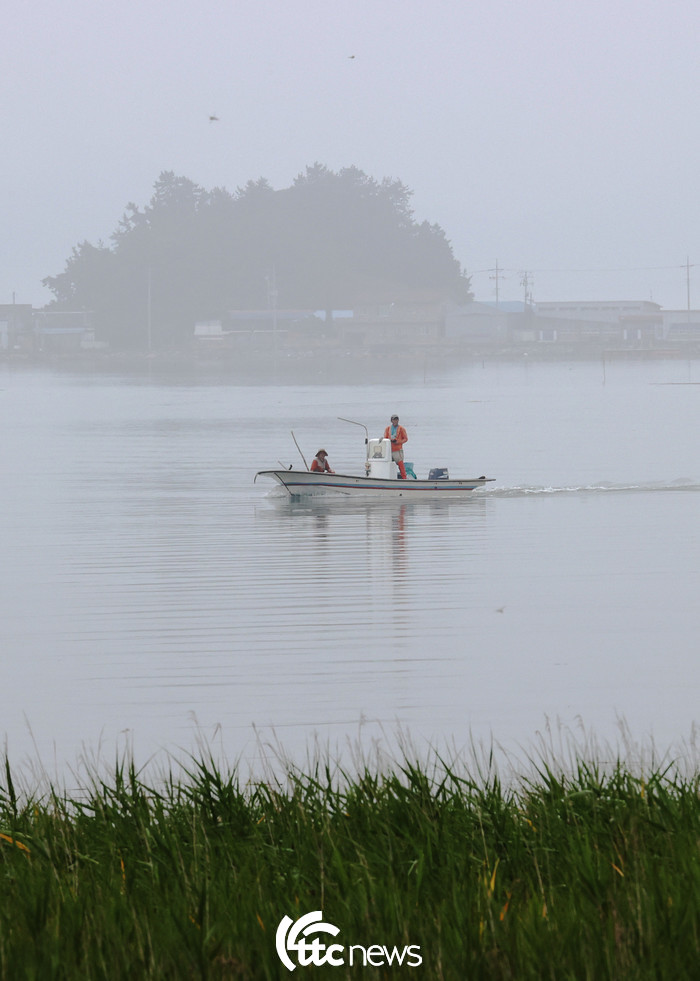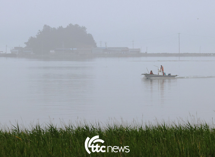 주춤한 장맛비에 후텁지근한 날씨를 보인 28일 전남 강진군 신전면 석천마을 앞 강진만(灣)이 자욱한 안개로 뒤덮힌 가운데 바닷일을 마치고 들어오는 배가 차분한 분위기를 만들고 있다.