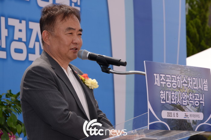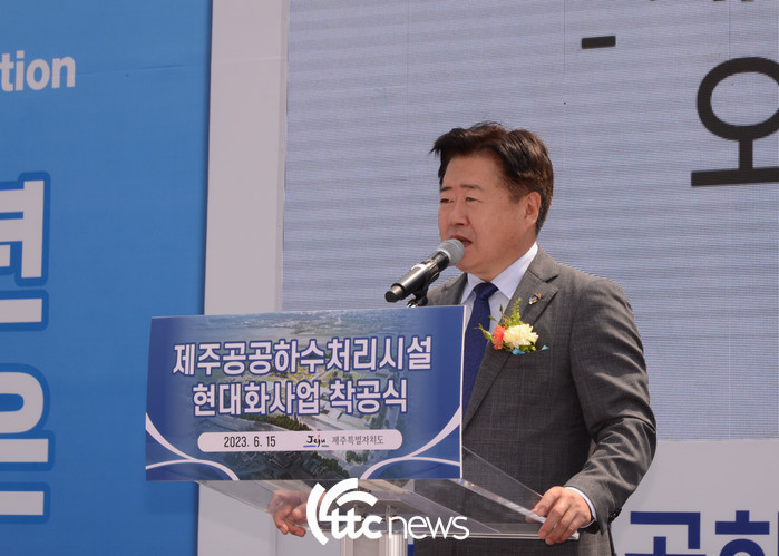 | ▲ 15일 제주 공공하수처리시설 현대화사업 착공식에서 오영훈 제주특별자치도지사가 축사를 통해 “제주의 지속가능한 미래를 열 핵심기반이 될 제주공공하수처리시설을 품은 도두동은 대한민국에서 가장 선진적인 환경기초시설을 갖춘 청정마을로 거듭날 것”이라고 강조하고 있다. |