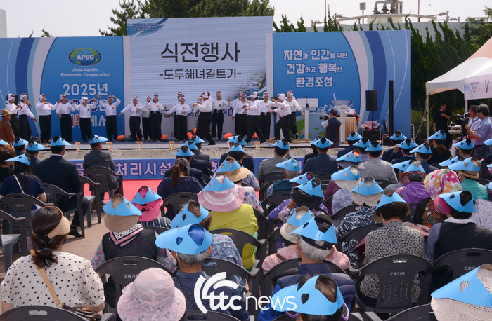 | ▲ 15일 제주 공공하수처리시설 현대화사업 착공식에서 도두마을 해녀들로 구성된 놀이패가 식전 공연을 하고 있다. |