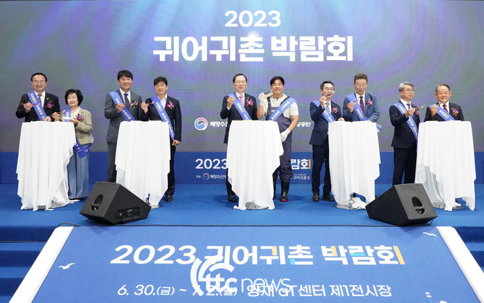 | ▲ 30일 오전 서울 서초구 aT센터에서 열린 2023 귀어귀촌 박람회에서 조승환 해양수산부 장관(왼쪽에서 다섯 번째)이 관계자들과 개막세레머니를 하고 있다(사진=해양수산부 제공) |