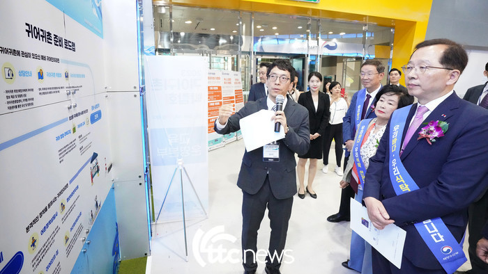 | ▲ 30일 오전 서울 서초구 aT센터에서 열린 2023 귀어귀촌 박람회에서 조승환 해양수산부 장관(오른쪽)이 관계자의 귀어귀촌 준비 로드맵에 대한 설명을 청취하고 있다(사진=해양수산부 제공) |