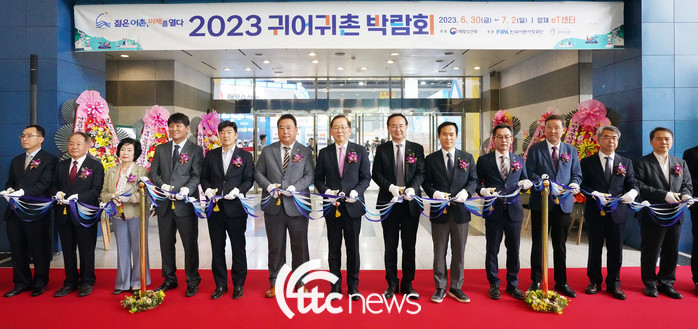 | ▲ 30일 오전 서울 서초구 aT센터에서 열린 2023 귀어귀촌 박람회에서 조승환 해양수산부 장관(왼쪽에서 일곱 번째)이 관계자들이 개막식 테이프를 절단하고 있다(사진=해양수산부 제공) |
