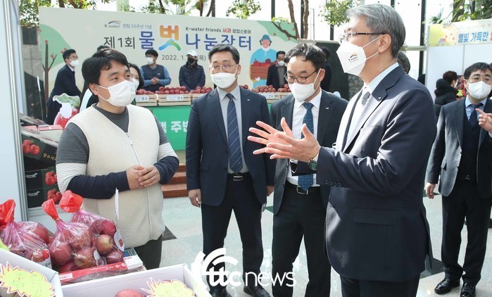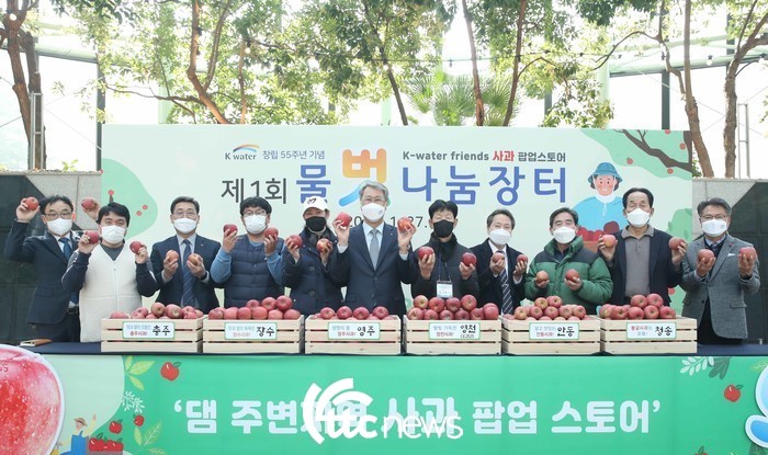 한국수자원공사는 27일 대전시 대덕구 본사에서 댐주변지역 사과 농가와 함께 ‘제1회 물벗 나눔장터, 댐주변지역 사과 팝업 스토어‘ 행사를 열었다.