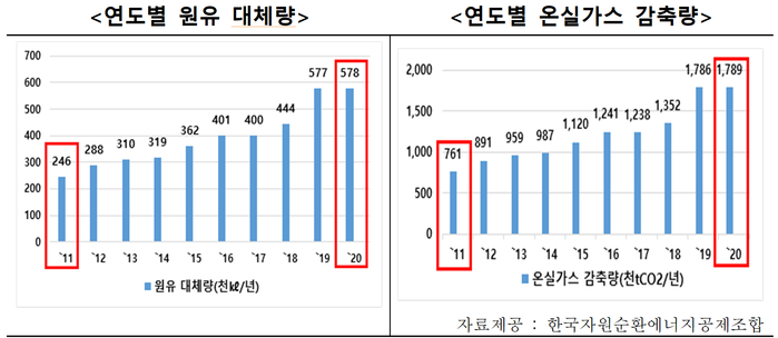 특히, 원유 대체량은 11년도 2.4억 리터에서 20년 5.7억 리터로 135% 증가했고, 온실가스 감축량은 11년도 76만 톤에서 20년 179만 톤으로 동일하게 135% 증가했다. 10년간 온실가스 감축량을 합산하면 1,212만 톤에 달해 국내 산업폐기물 소각전문시설이 국가온실가스를 감축시키는 효과가 큰 것으로 나타났다.
