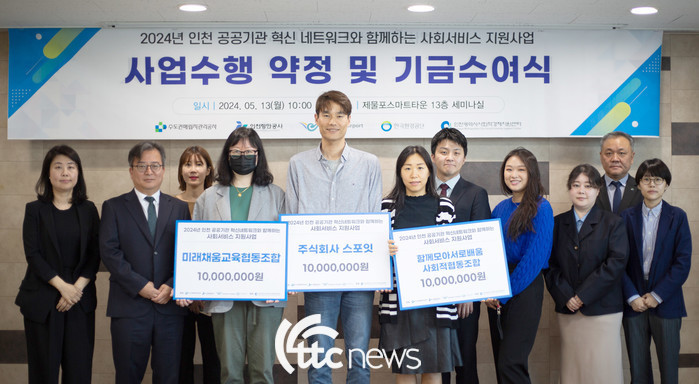 수도권매립지관리공사(사장 송병억)는 13일 ‘2024년 인천 공공기관 혁신네트워크와 함께하는 사회서비스 지원사업’ 기금수여식을 인천광역시사회적경제지원센터 세미나실에서 개최했다고 밝혔다.