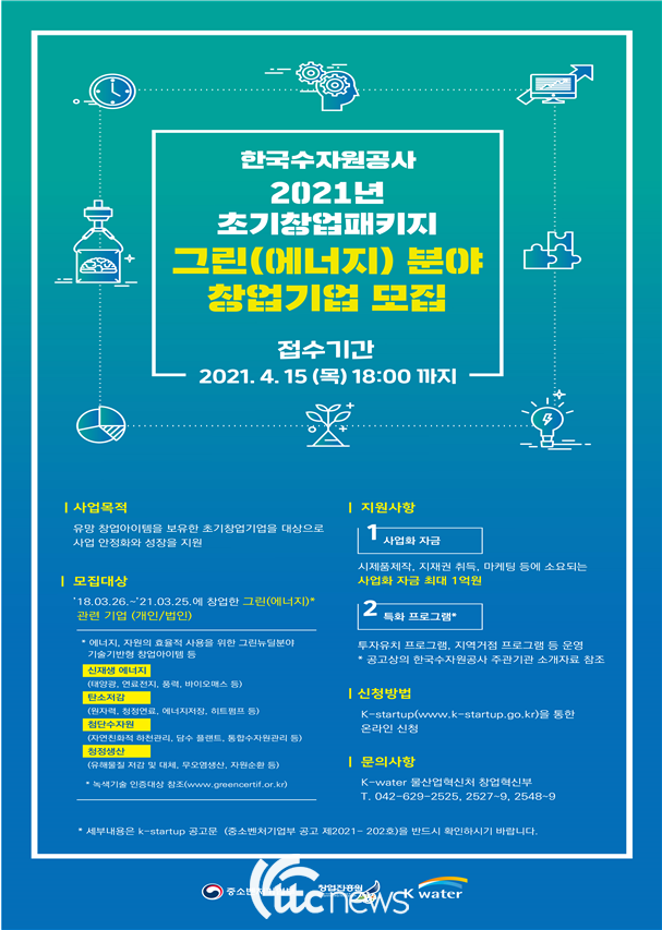 수자원공사는 12일, 국내 물산업의 혁신창업 생태계 조성과 그린뉴딜 분야 지원을 위해 ‘2021년 초기창업패키지 및 창업도약패키지 지원사업’에 참여할 기업을 모집한다고 밝혔다.