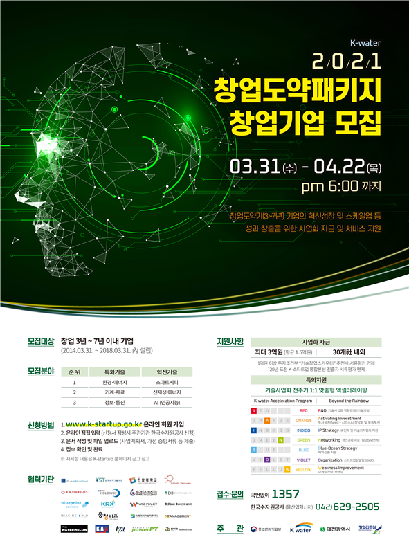 수자원공사는 기업 당 최대 3억 원의 사업화 자금 지원과 성장 촉진 프로그램 및 마케팅, 디자인 등 맞춤형 교육 서비스를 제공한다.