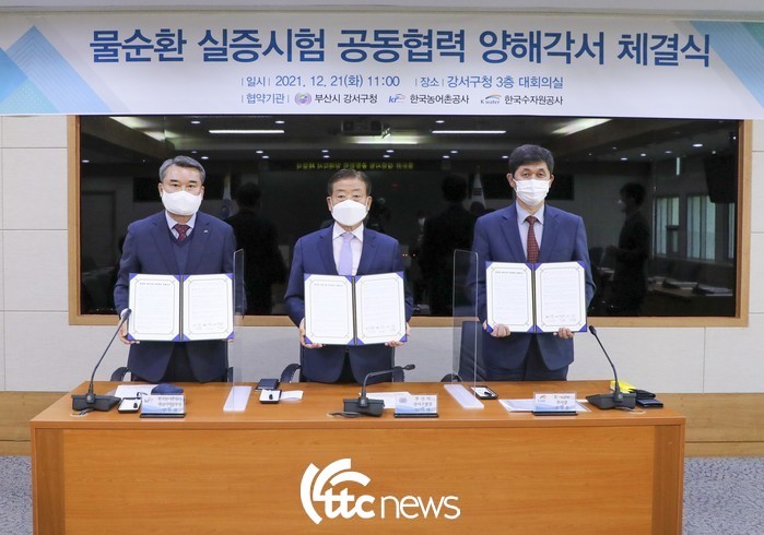 한국수자원공사는 21일 부산 강서구청에서 부산 강서구, 한국농어촌공사와 함께 ‘물순환 실증시험 공동협력 양해각서’를 체결했다고 밝혔다.