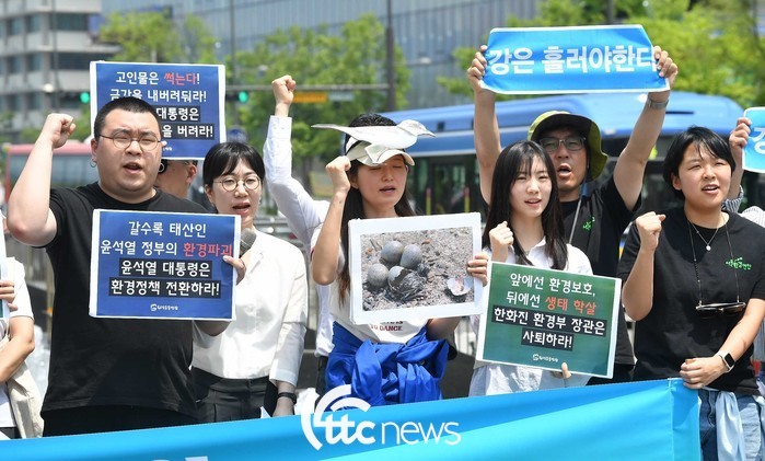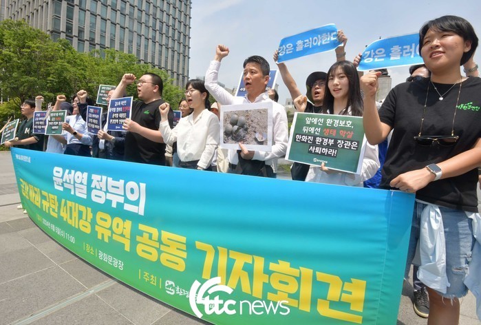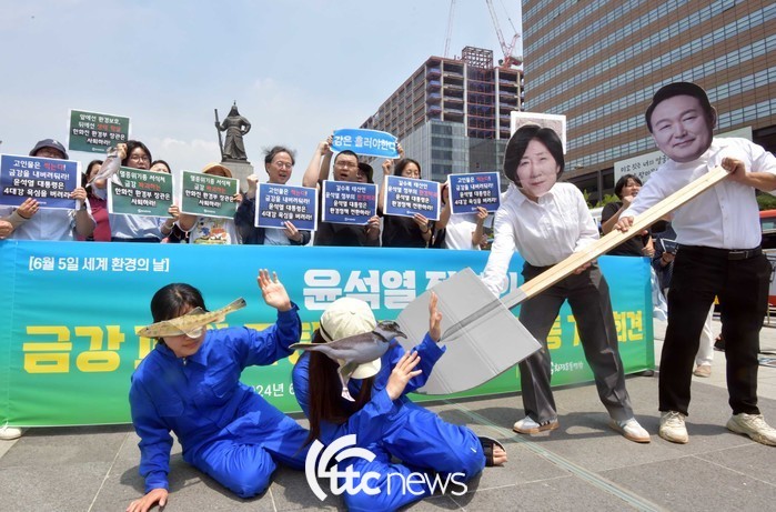 세계 환경의 날인 5일 환경운동연합과 경기환경운동연합 등 환경단체들이 서울 광화문광장에서 기자회견을 열고 윤석열 정부의 금강 파괴 규탄 4대강유역 공동기자회견을 개최했다.